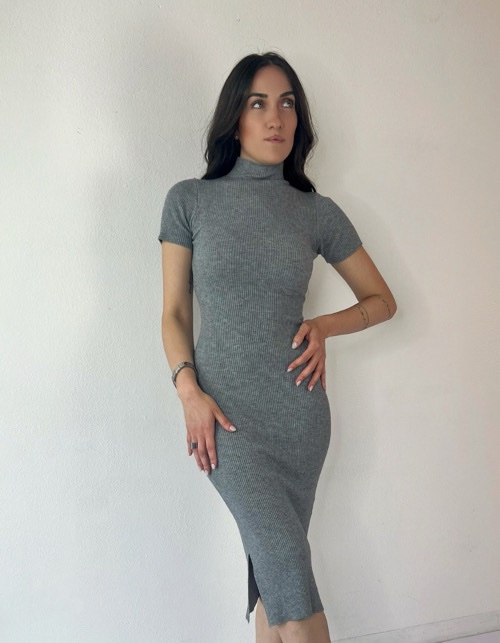 Abito con corpetto plissettato e scollo a V, spallina in tessuto e gonna ampia a ruota con riprese e spacco.