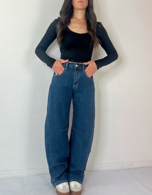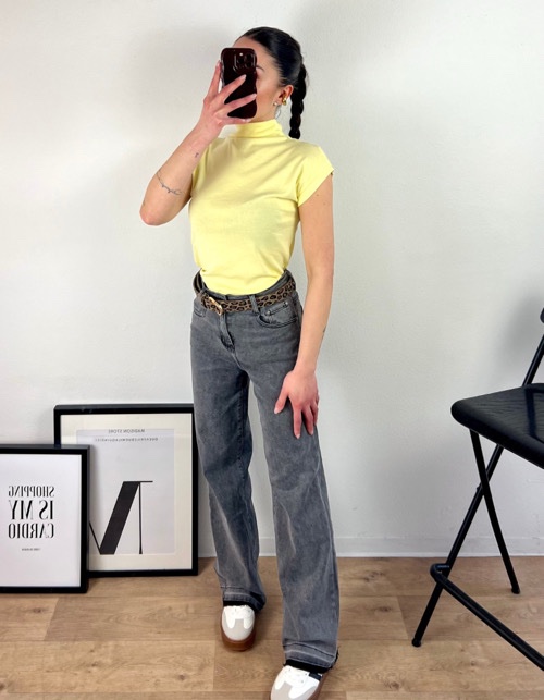 Jeans morbido elasticizzato dal taglio a palazzo, vita alta e passanti con cintura scamosciata incorporata